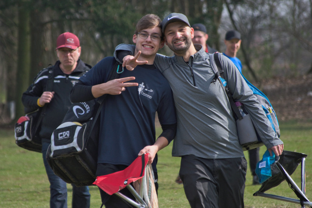 Am Ende gewann der Routinier Marek Mewes (rechts im Bild), der eine grandiose zweite Runde mit 29 Wurf ablieferte und insgesamt 62 Würfe benötigte. Anne Hoffmann gewann konkurrenzlos die Damenwertung mit 82 Wurf. Sehr erfreulich ist, dass auch drei sehr junge Spieler vom Discgolf-Virus infiziert wurden. Louis und Lucas Leube sowie Darius Trappe aus Peine spielten die 24 Bahnen souverän ab. Von ihnen werden wir sicherlich noch hören.