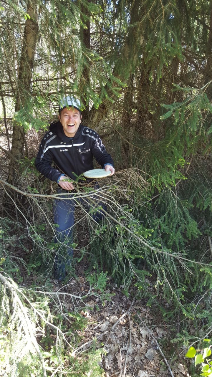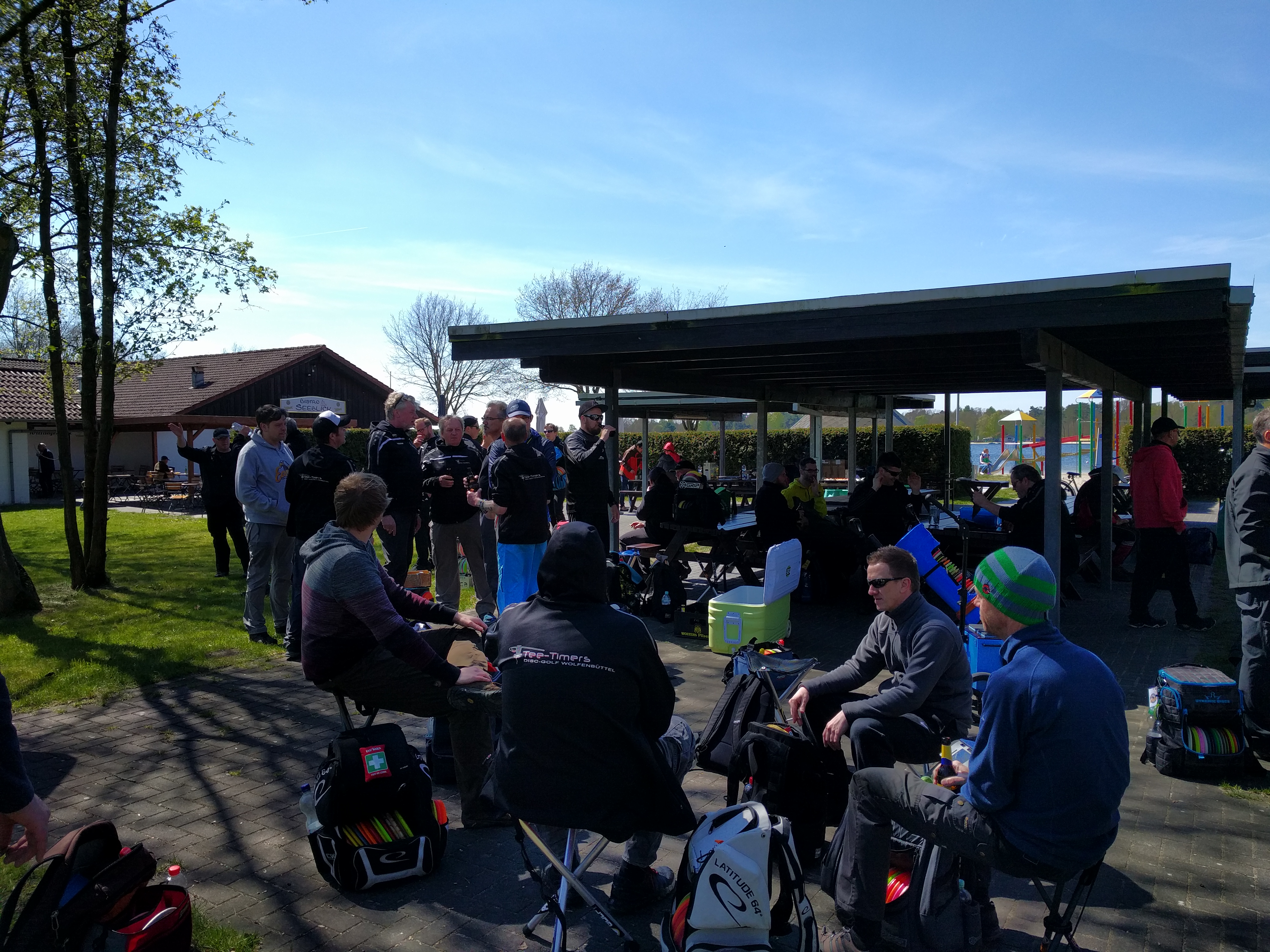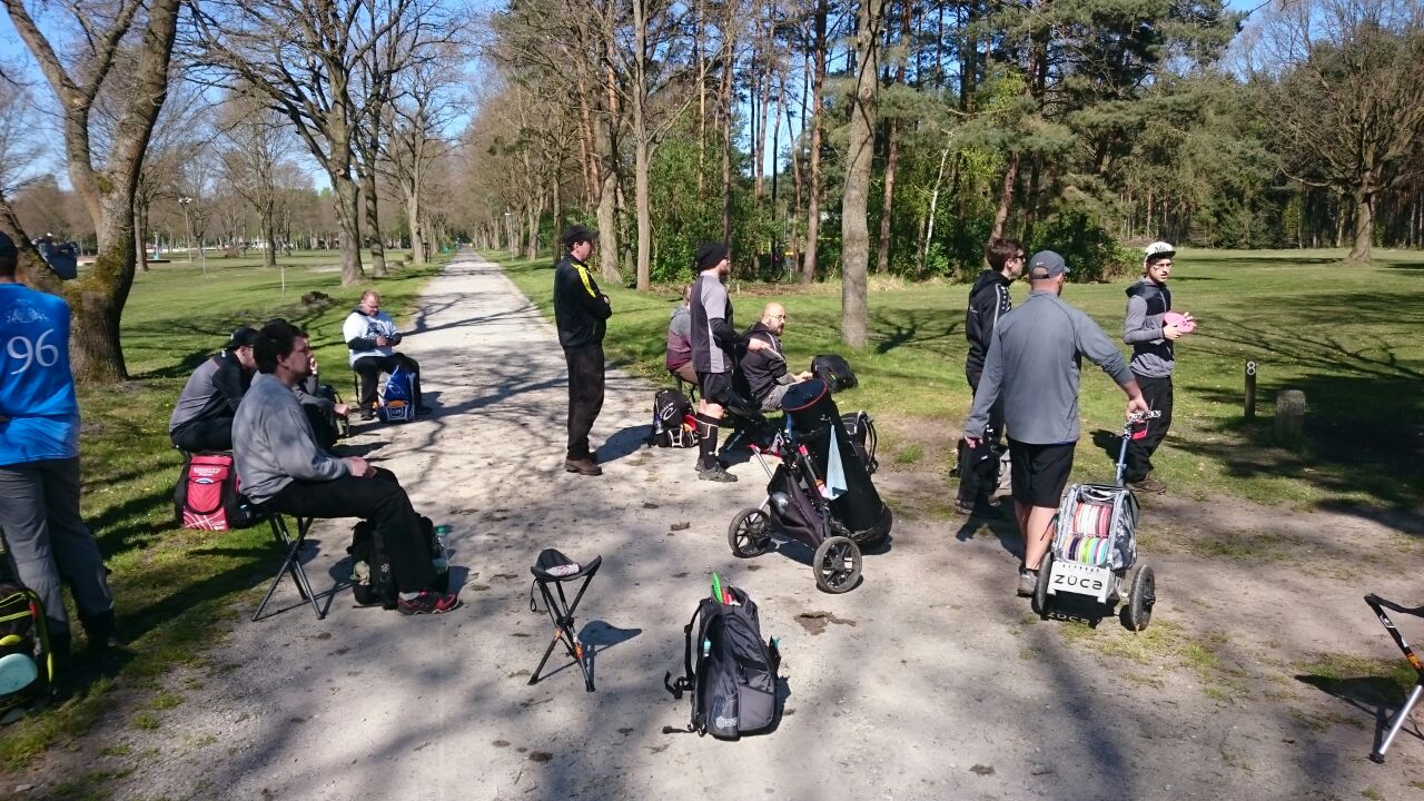 Nach einer kurzen Einweisung, welche Mandos wie zu umspielen sind, schickte Manni die bunte Schar Disc Golfer in 11 Gruppen (darunter 2 Warteflights) auf die beiden hintereinander zu absolvierenden Runden. Pünktlich um 9:45 Uhr wurde gestartet und schon begann die Suche nach den Scheiben auf der Waldbahn 7. Hier verschwanden so einige Scheiben im dichten Unterholz und führten teilweise zu Retees. Am Ende des Tages fanden hoffentlich alle Scheiben wieder zurück in die Taschen ihrer Besitzer ... es waren ja genug potentielle Spürnasen unterwegs, die beim Suchen ihres eigenen Plastiks auf vorher verlorenes stießen. Am Anfang der zweiten Runde ging dann ein lauter Jubelschrei auf das Naherholungsgebiet rund um den Tankumsee nieder, denn Icke hatte auf der Inselbahn 8 seine Scheibe mit dem ersten Wurf im Korb versenkt ... und das, um Gerüchten vorzubeugen, nicht vom Juniors-Abwurf, sondern vom regulären Tee. Die Freude war groß und sein erstes Turnierass wurde ausgiebig gefeiert. Für die restlichen Spieler hiess es weiter Birdie's zu sammeln und Bogeys zu vermeiden, was durch den immer stärker aufkommenden Wind nicht einfacher wurde.