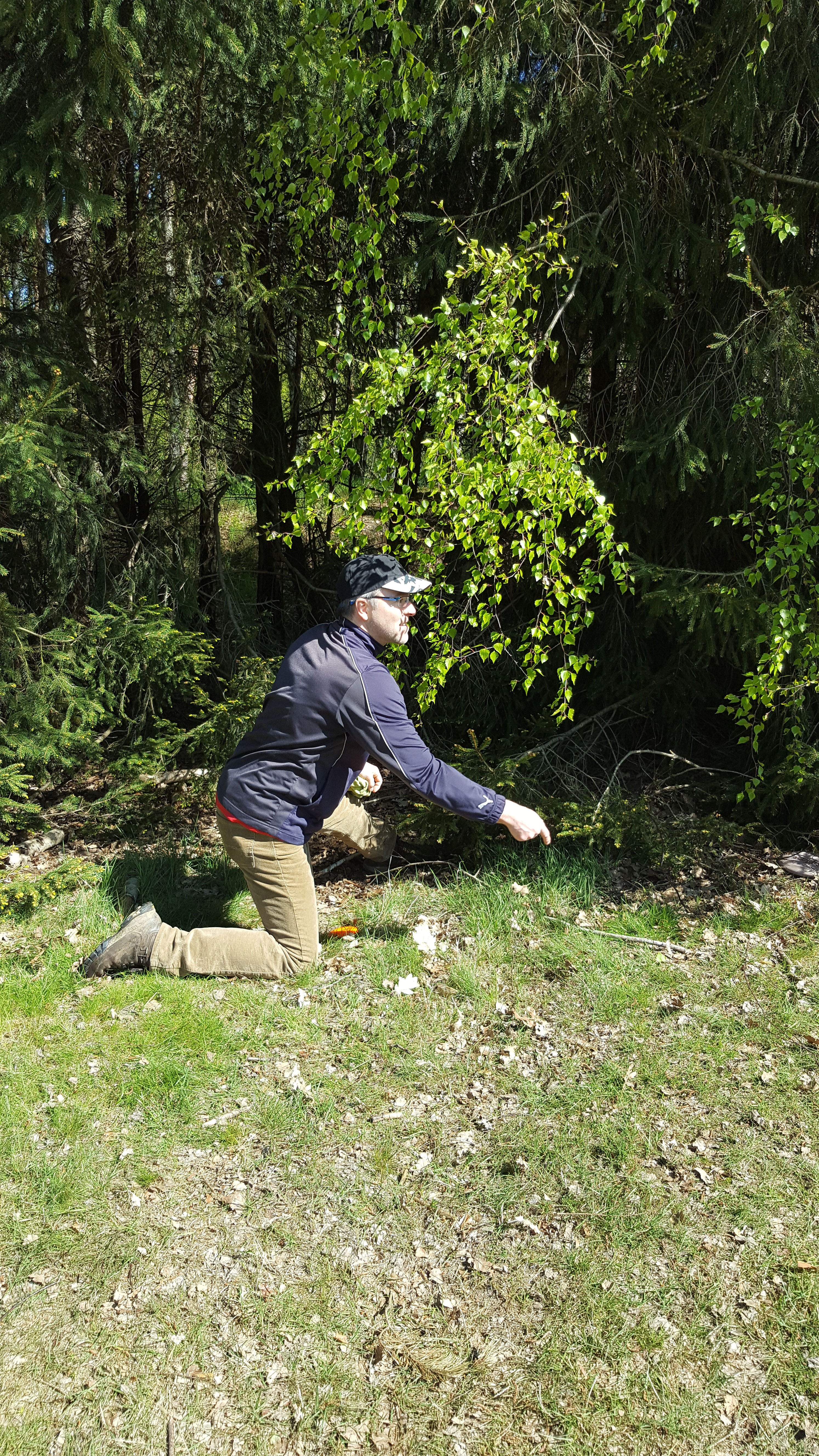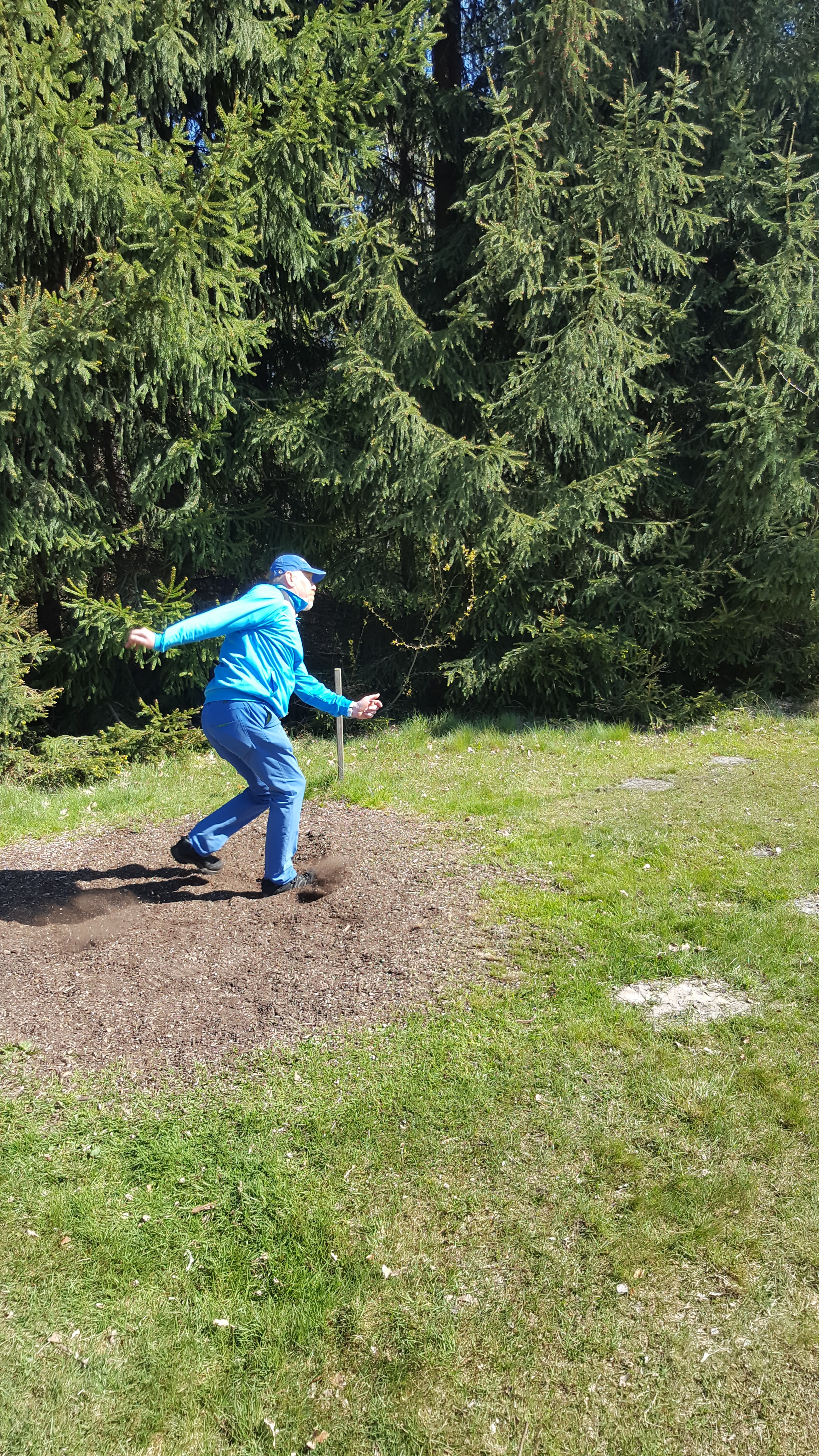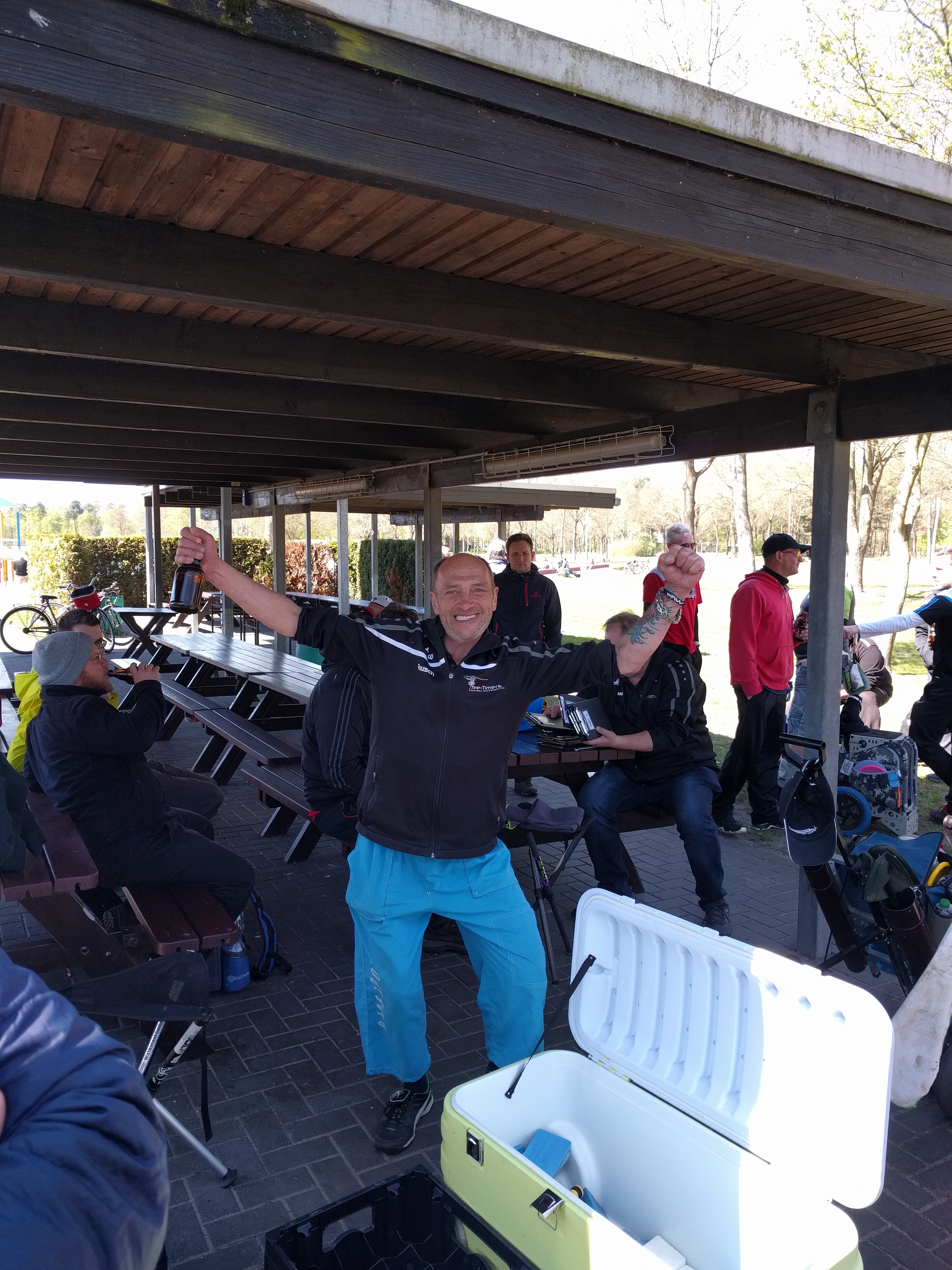 Nach einer kurzen Einweisung, welche Mandos wie zu umspielen sind, schickte Manni die bunte Schar Disc Golfer in 11 Gruppen (darunter 2 Warteflights) auf die beiden hintereinander zu absolvierenden Runden. Pünktlich um 9:45 Uhr wurde gestartet und schon begann die Suche nach den Scheiben auf der Waldbahn 7. Hier verschwanden so einige Scheiben im dichten Unterholz und führten teilweise zu Retees. Am Ende des Tages fanden hoffentlich alle Scheiben wieder zurück in die Taschen ihrer Besitzer ... es waren ja genug potentielle Spürnasen unterwegs, die beim Suchen ihres eigenen Plastiks auf vorher verlorenes stießen. Am Anfang der zweiten Runde ging dann ein lauter Jubelschrei auf das Naherholungsgebiet rund um den Tankumsee nieder, denn Icke hatte auf der Inselbahn 8 seine Scheibe mit dem ersten Wurf im Korb versenkt ... und das, um Gerüchten vorzubeugen, nicht vom Juniors-Abwurf, sondern vom regulären Tee. Die Freude war groß und sein erstes Turnierass wurde ausgiebig gefeiert. Für die restlichen Spieler hiess es weiter Birdie's zu sammeln und Bogeys zu vermeiden, was durch den immer stärker aufkommenden Wind nicht einfacher wurde.