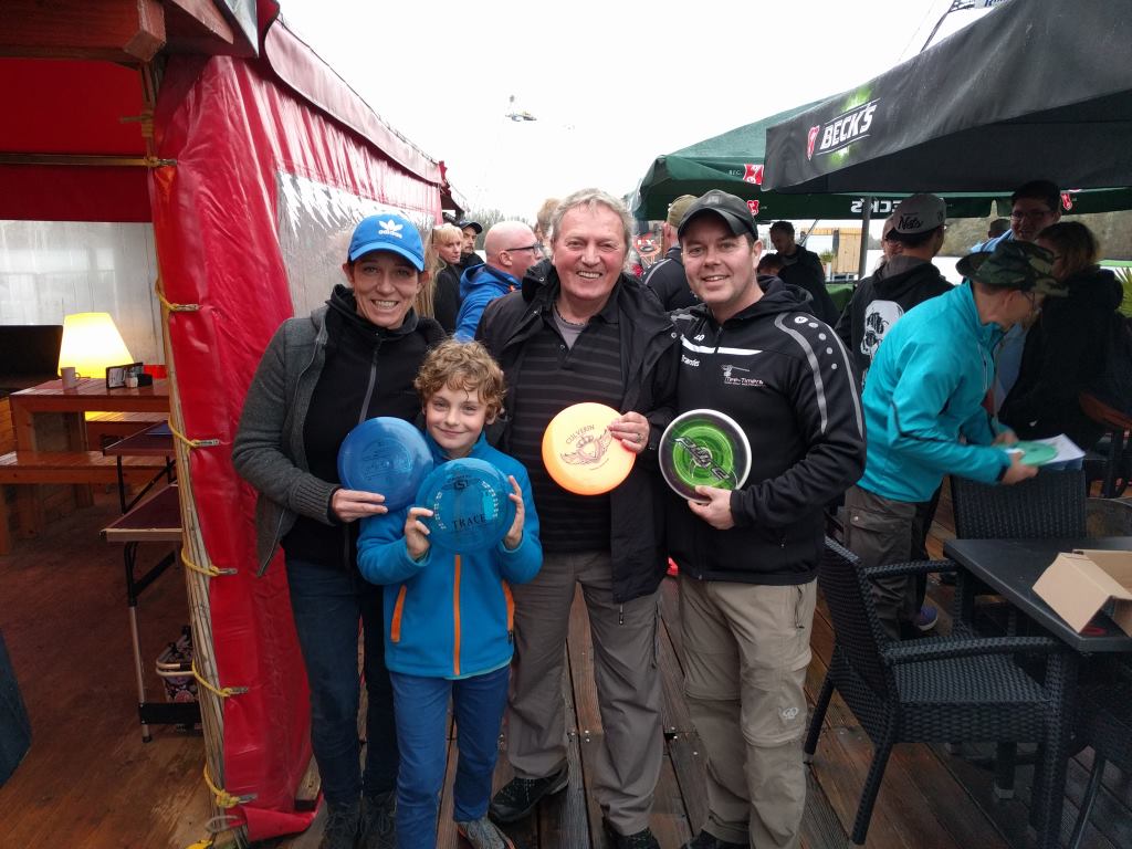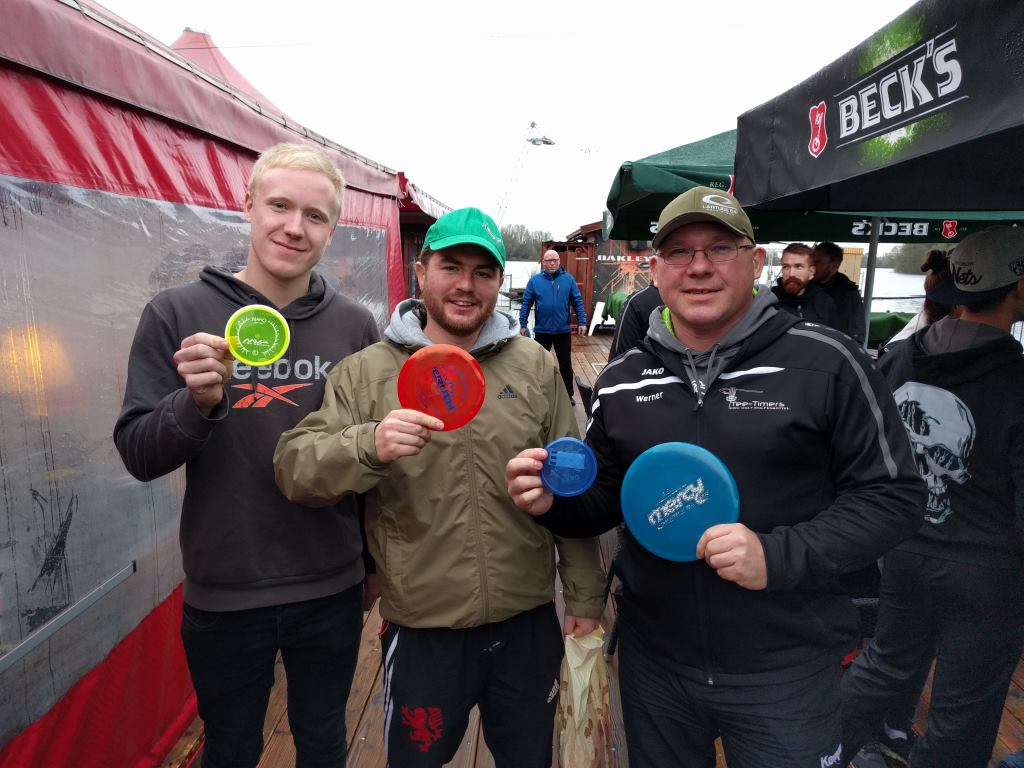 So kam es, dass sich trotz des wirklich besch..eidenen Wetters 50 Kontrahenten einfanden und den widrigen Umständen trotzten. Basket Dash war aber unter diesen Bedingungen auch gesundheitlich nicht zu verantworten. Den CTP-Preis von Bahn 6 angelte sich Tobi Lülf mit 2,16 m und nach dem Turnier ging es im "Sonnendeck" – bei dem Wetter muss man das in Anführungszeichen setzen – weiter mit dem Pubquiz. Tobis anfängliche Vorstellung, sich sämtliche Preise unter den Nagel zu reißen nahm hier ein jähes Ende. Er konnte aber seinen Team-Kollegen Fabian Kaune als Schuldigen ausmachen, weil er als selbst ernannter Discmania-Experte eine FD nicht von einer FD2 unterscheiden konnte. So fehlten die entscheidenden Punkte um beim Führungs-Trio mitzuhalten.