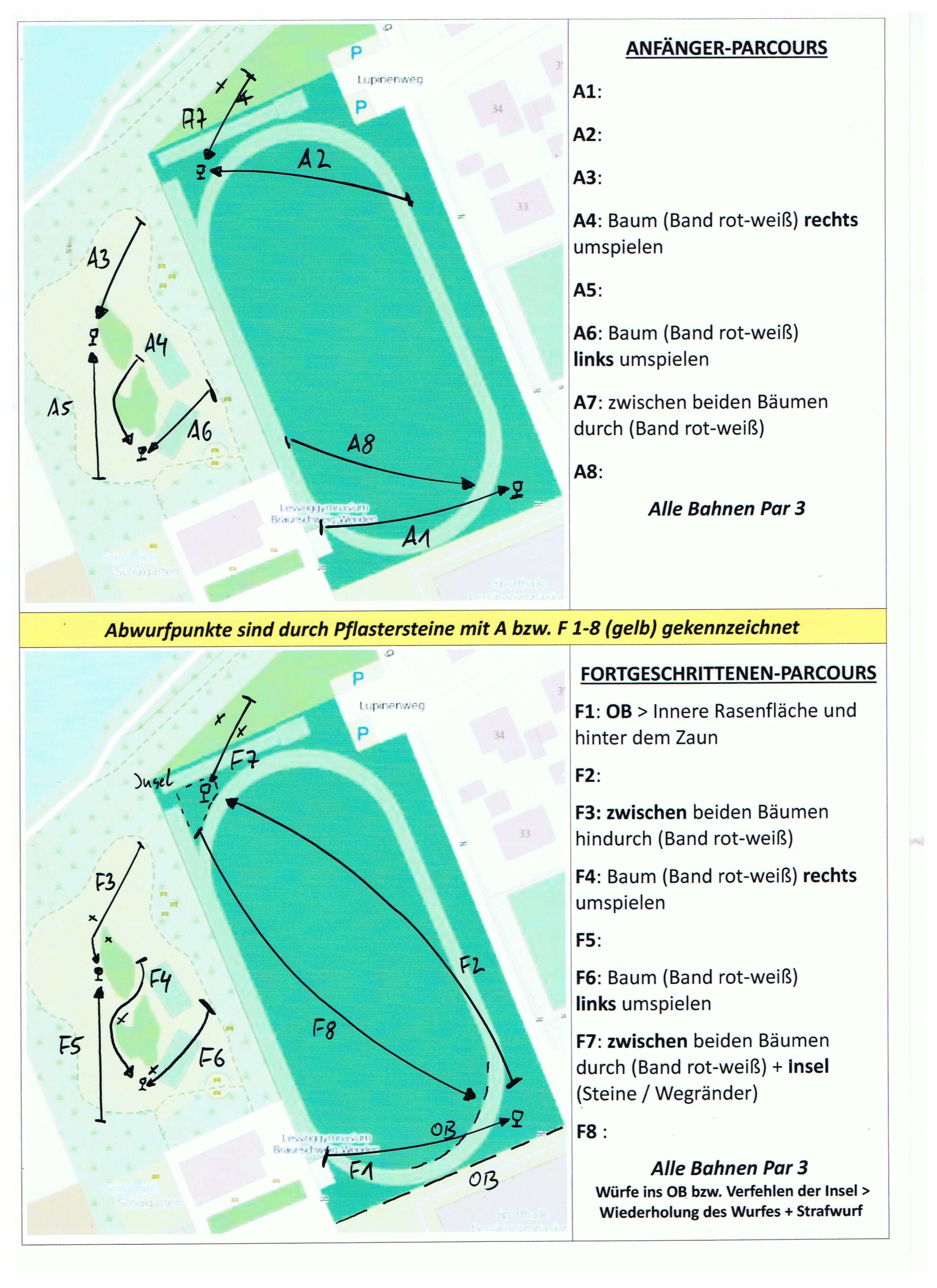 Anfängerparcour mit acht eher kurzen und einfachen Bahnen. Fortgeschrittenen-Kurs mit acht Bahnen bis 140 Meter bzw. einigen Mandos und OBs. Der einfache richtet sich besonders an jüngere Schüler, der zweite an ältere Schüler oder eben sonstige Spieler. Das Schulgelände ist bis ca. 17.00 Uhr geöffnet. Zwischen 14.00 - ca.17.00 Uhr kann gespielt werden; es ist allerdings möglich, dass dort Sportunterricht stattfindet.