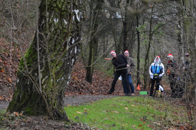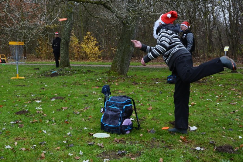So weit, so schlecht. Doch weil am Ende – und insbesondere am Nikolaustag – natürlich immer das Gute siegt, ging dieser Plan nicht auf. Während sich die Protagonisten dieses Schmierentheaters am Ende als unfähig erwiesen, den sich auf solch unlautere Weise verschafften Vorteil zu nutzen, und sich so schließlich im sportlichen Niemandsland wiederfanden, brillierten andere. Nicht ganz unerwartet dominierte Gene Rüdiger, der sich durch die unkonventionelle Bahnführung noch am wenigsten verunsichern ließ, den Rest des Teilnehmerfeldes und landete mit 74 Würfen bei Par 76 unangefochten auf dem ersten Platz. Christian Aranowski hatte leider seinen Taschenrechner vergessen und konnte dieses Handicap auch durch seine überragende Treffgenauigkeit nicht ausgleichen, so daß er den möglichen zweiten Platz bedauerlicherweise verspielte. Diesen belegte – ebenfalls keine echte Überraschung – Tobias Lülf mit 76 Würfen. Für den Experten allerdings verblüffend gelang es Marek Mewes aus Helmstedt(!), sich mit 77 Würfen auf Platz drei zu schieben.