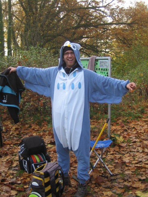 Beim abschließenden elften Turnier im Lindener Gutspark wurden die 71 Teilnehmer durch ein Wellenbad der Gefühle geschickt. Zunächst nahmen die Disc-Golfer schweigend und tief bewegt Abschied von Peter Thies, Michael Heyduck und ihrer "Legende" Wilhelm Heumann. Anschließend fiel es vielen zunächst nicht ganz leicht, über die tolle Idee der Peiner Eulen zu schmunzeln, die ihrem "Präsi" zum 30. Geburtstag ein ganz besonderes Geschenk gemacht hatten: Im Eulenkostüm musste er die 2 x 9 Bahnen absolvieren, hinzu kam, dass er die Abwürfe für seinen Flight mit einem Besen reinigen musste.