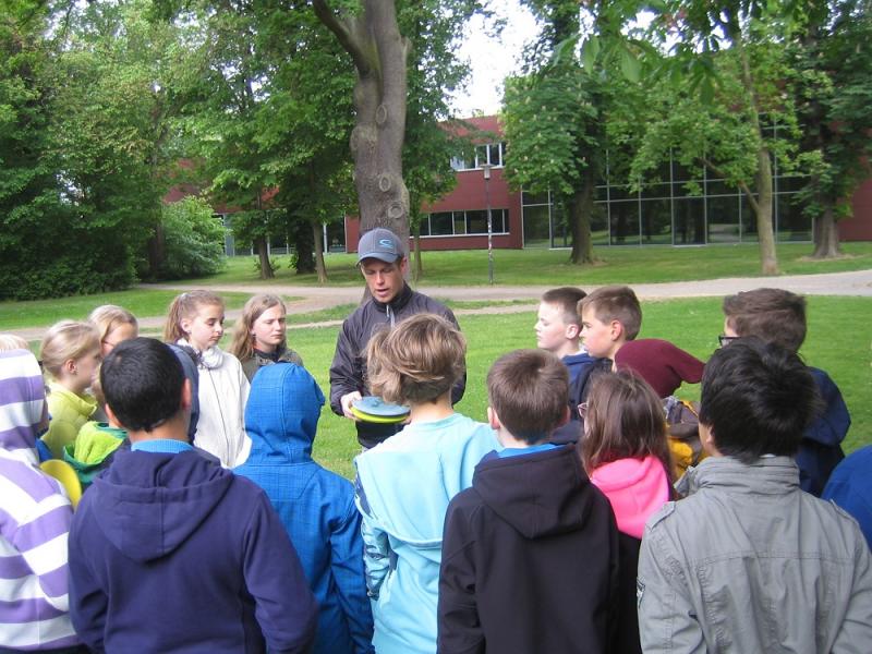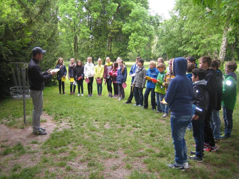Ende Mai erlebte die Klasse 5c vom THG zwei ganz besondere Sportstunden: Tee-Timer Tobias Behrens hatte sich noch vor der Arbeit die Zeit genommen, um den Schülern seinen Lieblingssport näher zu bringen. "Das sind ja wirklich einige Talente dabei", konnte der 36-Jährige nach der Trainingsstunde zufrieden feststellen. Ob beim Putten oder beim Weitwurf per Rückhand - alle Schüler waren mit Begeisterung bei der Sache. Besonders, als der 2015-Islander die unterschiedlichen Flugeigenschaften der Discs demonstrierte, ging ein Raunen durch den Park.