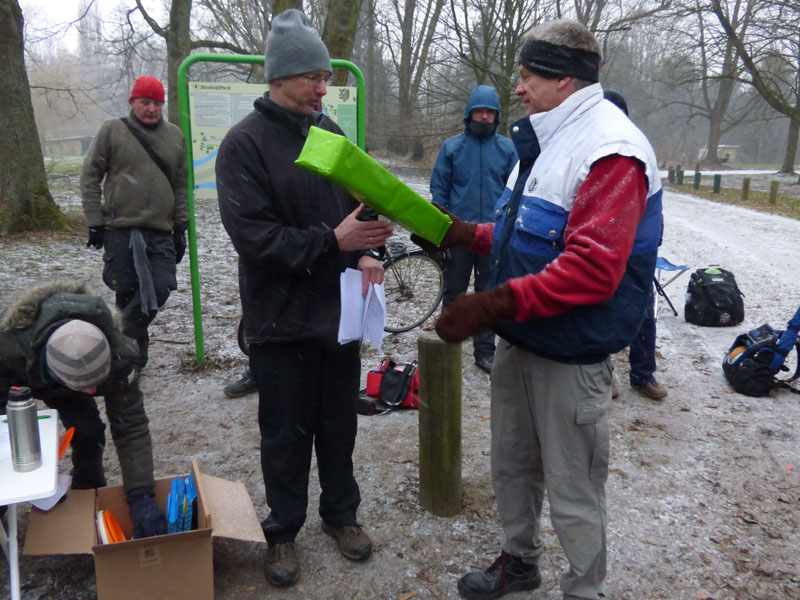 TD Andreas Hördt vom gastgebenden MTV Braunschweig ließ die Teilnehmer dann auch nicht lange fröstelnd warten, er gab trotz anderslautenden Forderungen nur einen kurzen Einblick in die letztlich erfolgreiche Entstehung des jüngsten Parcours in der diesbezüglich ohnehin verwöhnten Region zwischen Harz und Heide. Bemerkenswert dabei, der Parcours ist in seinen Grundzügen die Wiege des Disc-Golf in Braunschweig. Einige der Anwesenden haben vor über 20 Jahren dort bereits auf Objekte gespielt und sogar eine Deutsche Meisterschaft hat 1997 dort bereits stattgefunden.