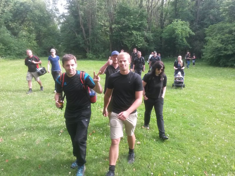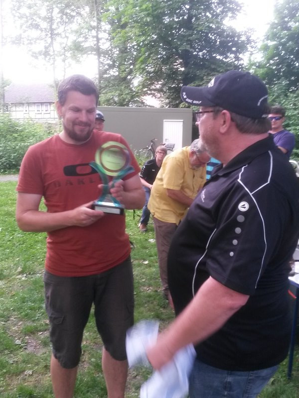 Nach einem klaren Halbfinale mit den Ergebnissen Michael Schulenburg (27 Würfe) gewinnt gegen Nik Eisel (30); Maik Groneuer (29) gewinnt gegen Christian Aranowski (34) haben die Kandidaten das Finale deutlich spannender gemacht. Die Zuschauermassen schwanden trotz der steigenden Spannung langsam, denn der Gasgrill von Sportskamerad Hans war schon heiß, die Getränke lauwarm bis angekühlt. Nach Bahn 6 führte Maik mit einem Wurf, streute aber an Bahn 7 ein unnötiges Bogie ein, während Micha einen schwierigen Sit-and-straddle-Putt zum Birdie einlochte. Führung für Micha! Nun entwickelte er seinen gefürchteten „Biestmodus“ und spielte die übrigen Bahnen souverän herunter. Maik musste alles riskieren und haute die Scheiben noch mehrmals in die üppige Botanik. Ergebnis: Michael 27 Würfe, Maik 30.