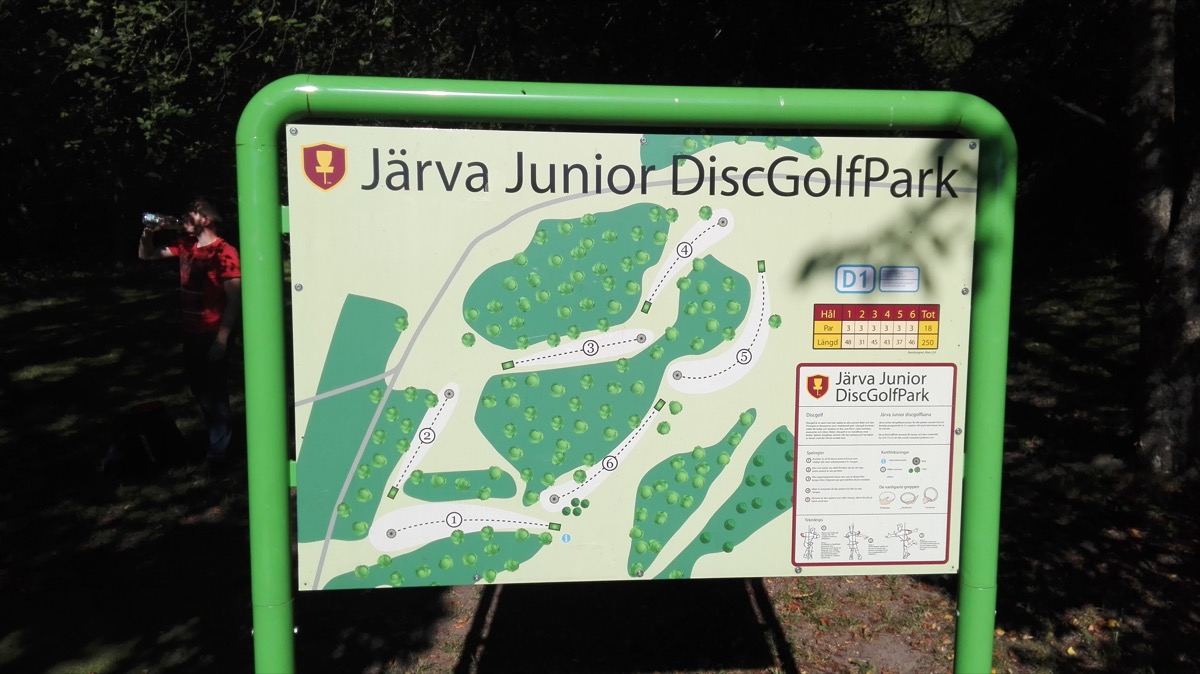 Am Montag um sechs Uhr klingelte dann mein Wecker, damit ich nochmal eben in den Fitnessraum und Pool konnte, um mich und vor allem meinen Rücken (einige haben sicher von den Beschwerden gehört) spezifisch aufwärmen konnte. Mein Physiotherapeut hat mir da gute Übungen gegeben. Um 7 dann in voller Montur zum Frühstück am See und um 8 mit Bus und Bahn zum Park. Von der U-Bahnstation Hjulsta waren es dann noch 15 Minuten zu Fuß und man hat ihn erreicht: den Austragungsort der European Masters. Hier findet man 27 Bahnen mit einer Bahnenlänge von insgesamt 3,4 Kilometer auf verschiedensten Gebieten. Mit darunter sind Wald, Berg und einfach nur pervers weit. Die Fairways sind allesamt gemäht und jede Bahn hat einen mindestens 4 Meter langen Abwurf mit anschließender Auslaufzone, sodass man nicht gleich stolpert. Einzelne Bahnen lassen sich gut bei YouTube anschauen, da kommt das wesentlich besser rüber. Der Kurs ist offiziell nicht gratis, wird aber permanent von einem Mann mit Hund bewirtschaftet. Dieser kümmert sich um die Erhaltung der Abwürfe oder mäht die Fairways, welche erstaunlich groß ausfallen.