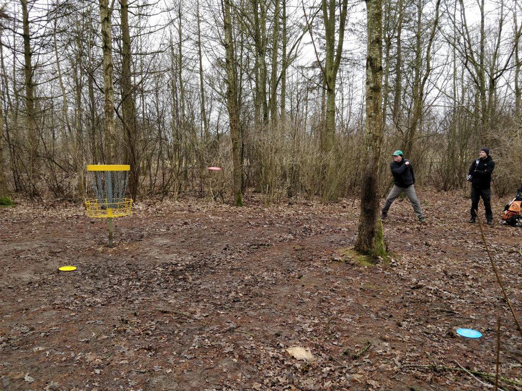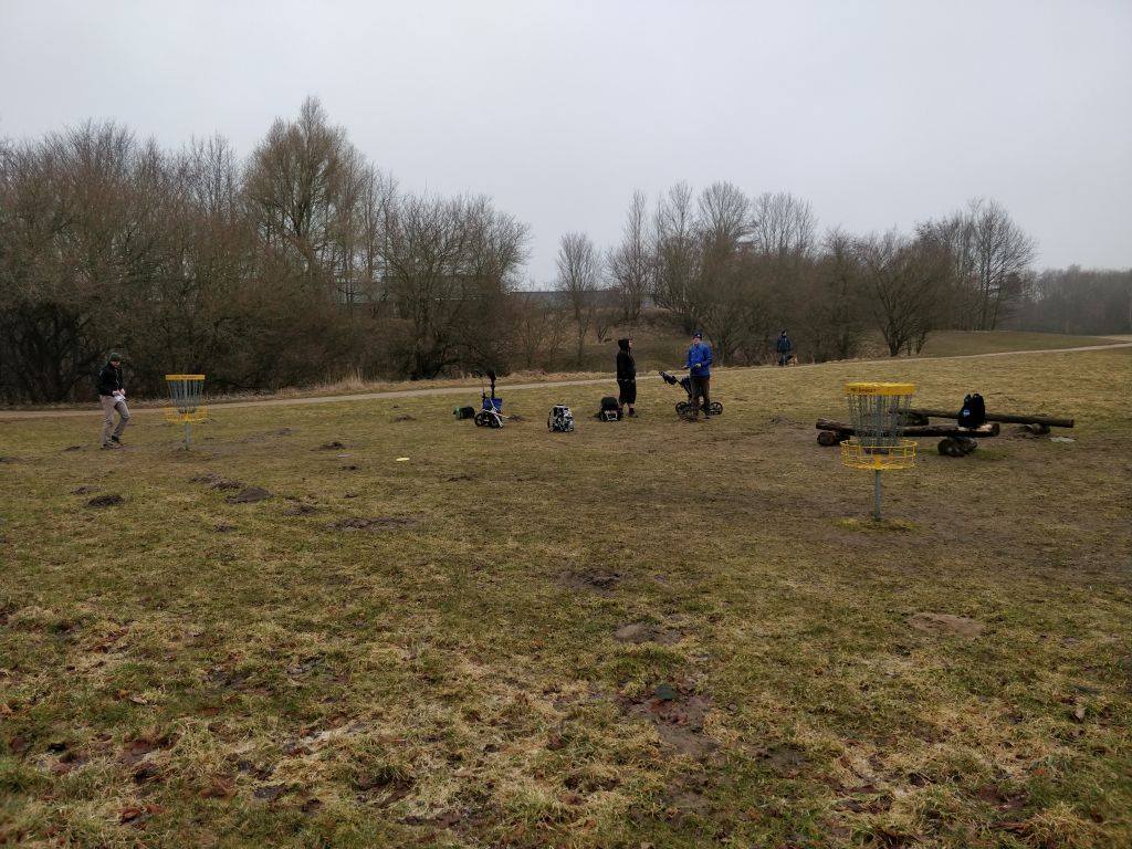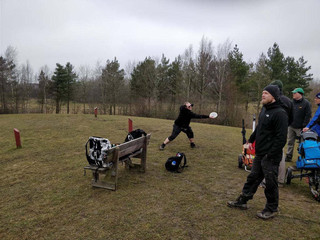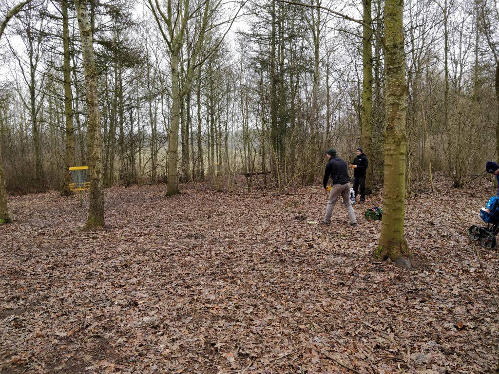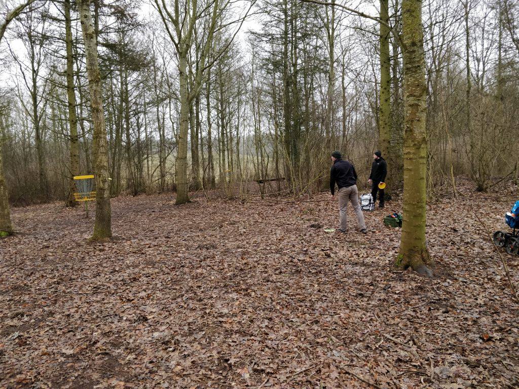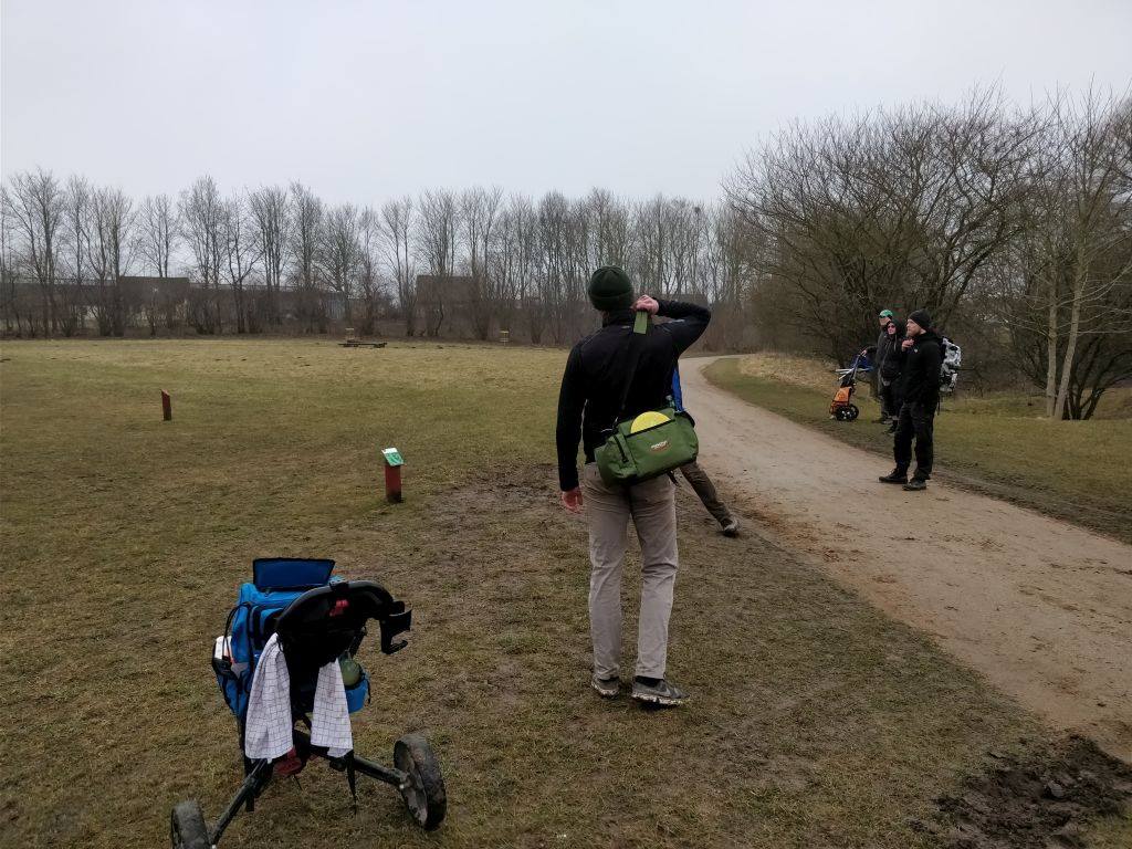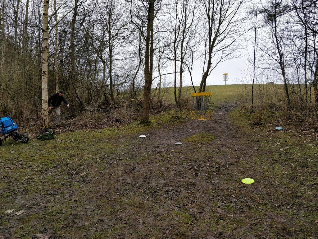 Als hätte man mich erwartet, erschienen noch fünf weitere Mitstreiter vom ortsansässigen Disc Golf Klubben Opdrift am Kurs, und nach einem mir noch nicht nachvollziehbaren Prozedere was wie Münzwerfen mit Puttern aussah wurde irgendwie bestimmt, dass ich die Ehre hatte, mit dem lokalen 938-rated "Big Arm" Kasper die 18 Bahnen anzugehen. Neben ihm spielte auch Jakob Burkard (Rating 944) vom weißen Tee, wir anderen durften vom gelben Tee ran. Es wurde nach dem "best-shot"-Modus gespielt, so dass mein nervöser erster Drive ins erste Hindernis keine großen Auswirkungen hatte. Dennoch spürten wir nach drei Bahnen mit zwei Wurf Rückstand den Druck, doch Kasper wusste zu beschwichtigen: "Bahn 17 ist noch nicht gespielt".