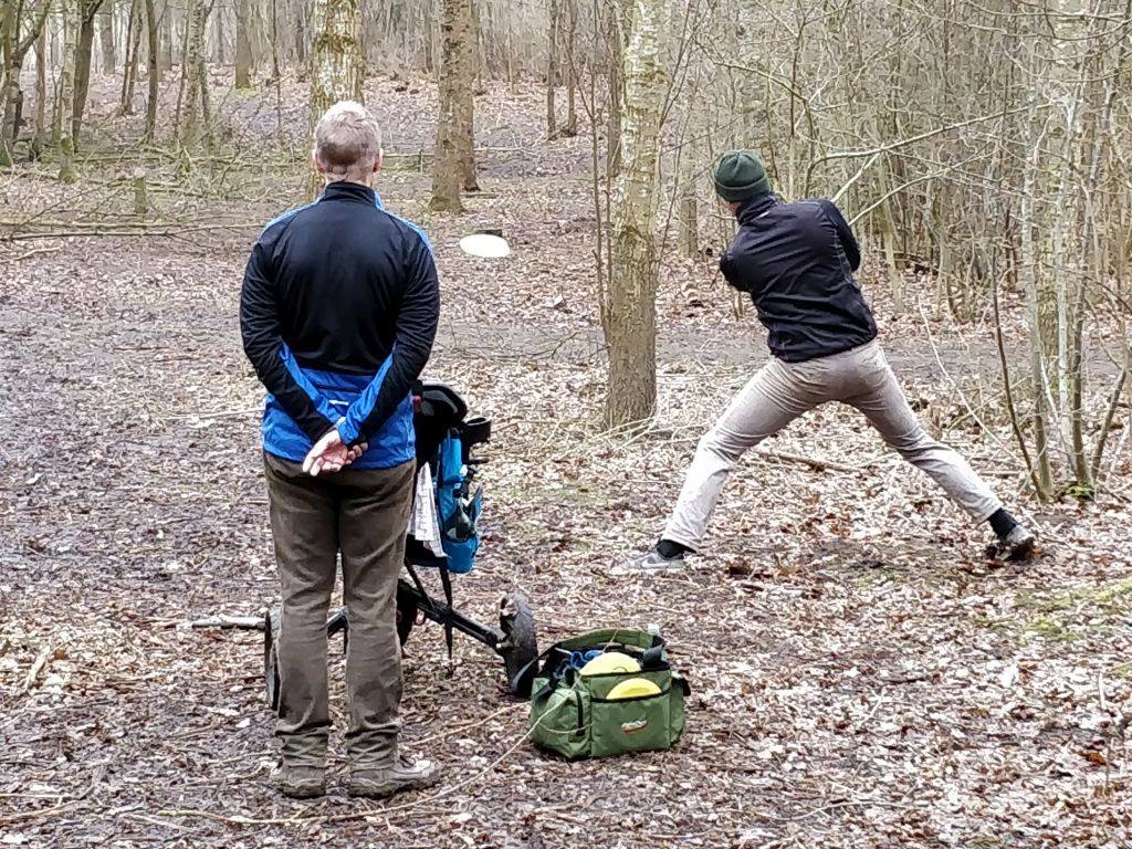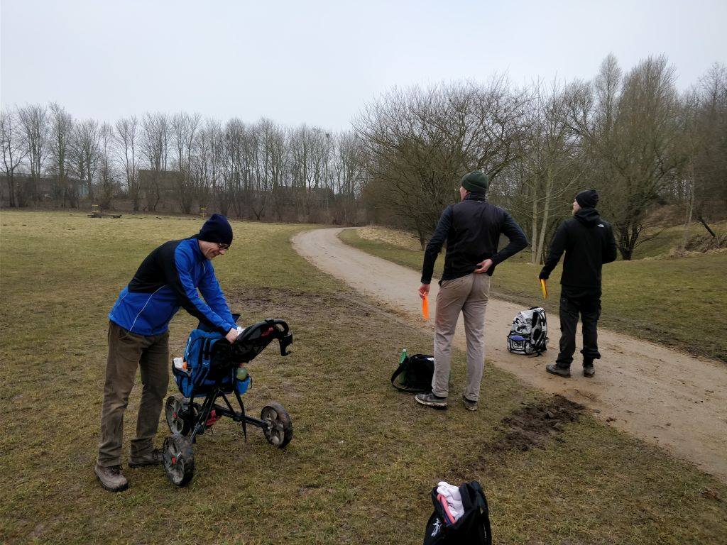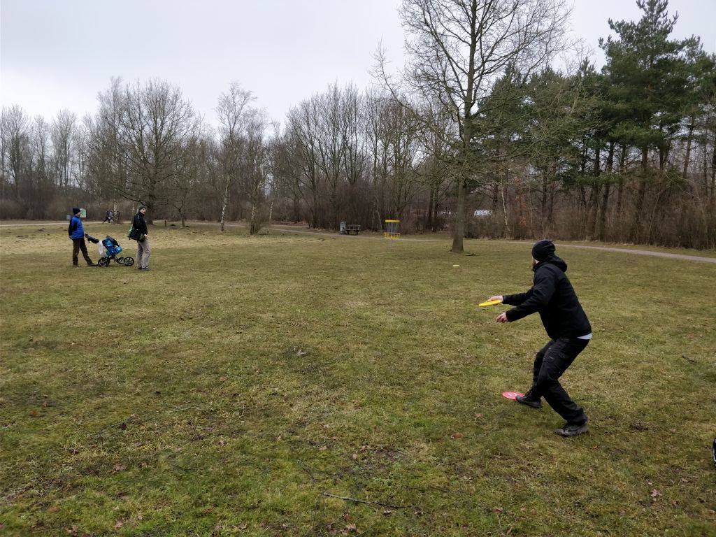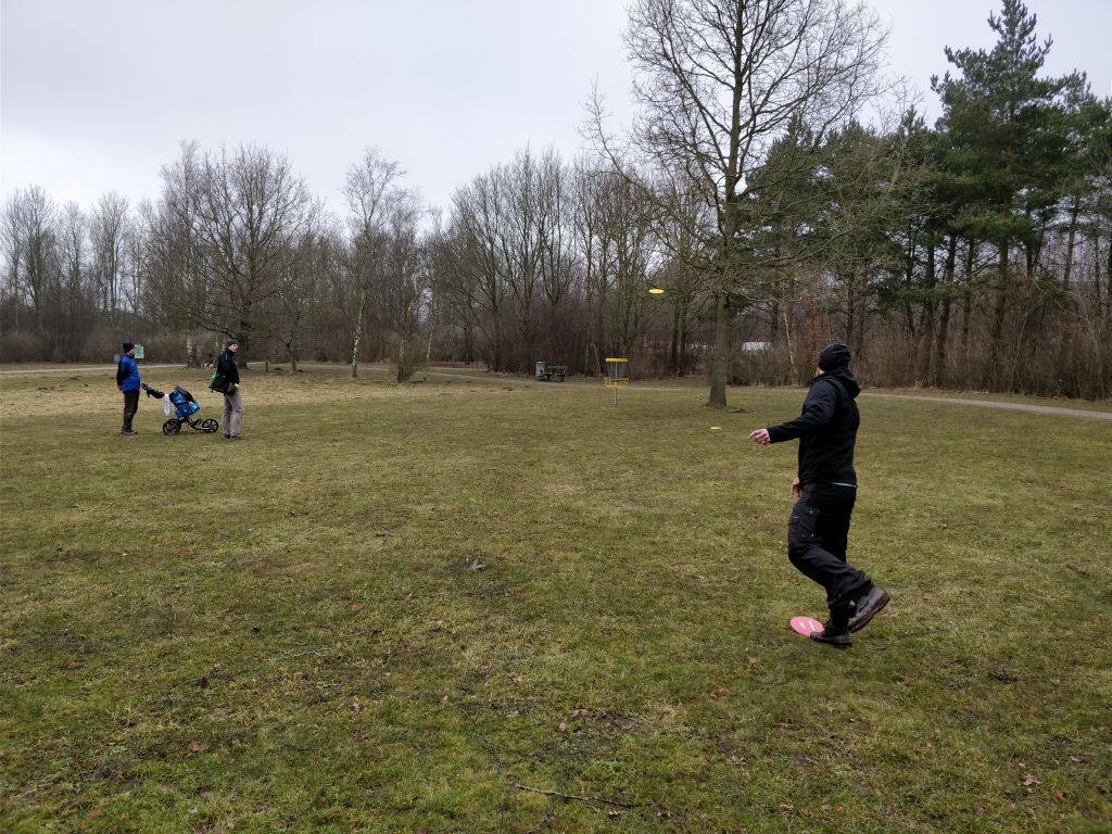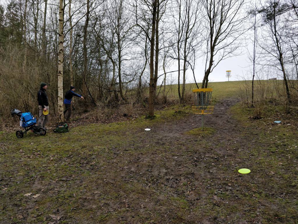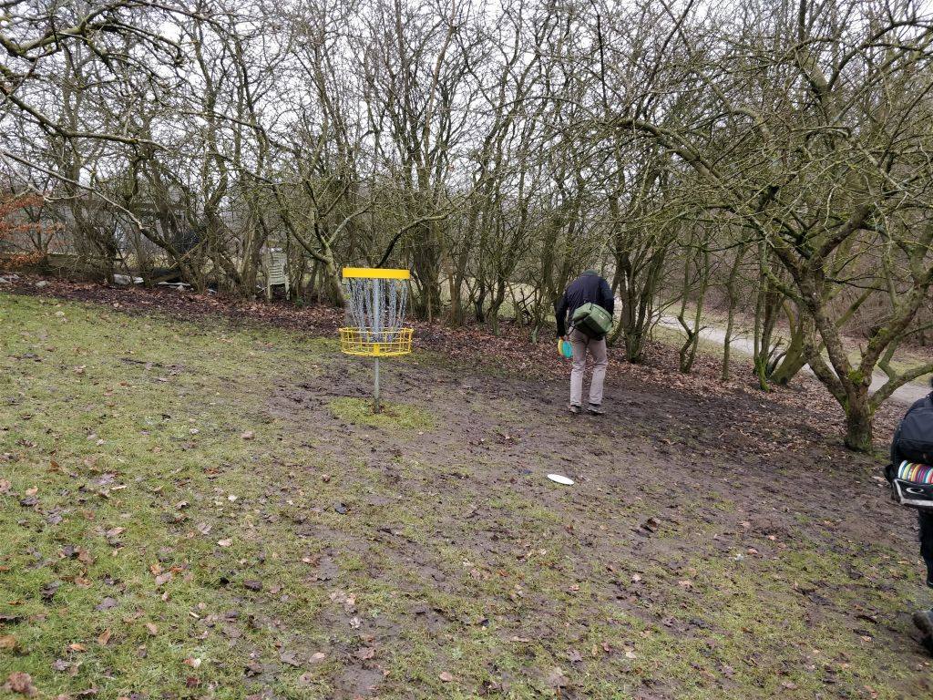 Als hätte man mich erwartet, erschienen noch fünf weitere Mitstreiter vom ortsansässigen Disc Golf Klubben Opdrift am Kurs, und nach einem mir noch nicht nachvollziehbaren Prozedere was wie Münzwerfen mit Puttern aussah wurde irgendwie bestimmt, dass ich die Ehre hatte, mit dem lokalen 938-rated "Big Arm" Kasper die 18 Bahnen anzugehen. Neben ihm spielte auch Jakob Burkard (Rating 944) vom weißen Tee, wir anderen durften vom gelben Tee ran. Es wurde nach dem "best-shot"-Modus gespielt, so dass mein nervöser erster Drive ins erste Hindernis keine großen Auswirkungen hatte. Dennoch spürten wir nach drei Bahnen mit zwei Wurf Rückstand den Druck, doch Kasper wusste zu beschwichtigen: "Bahn 17 ist noch nicht gespielt".