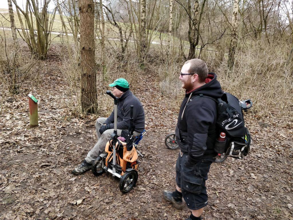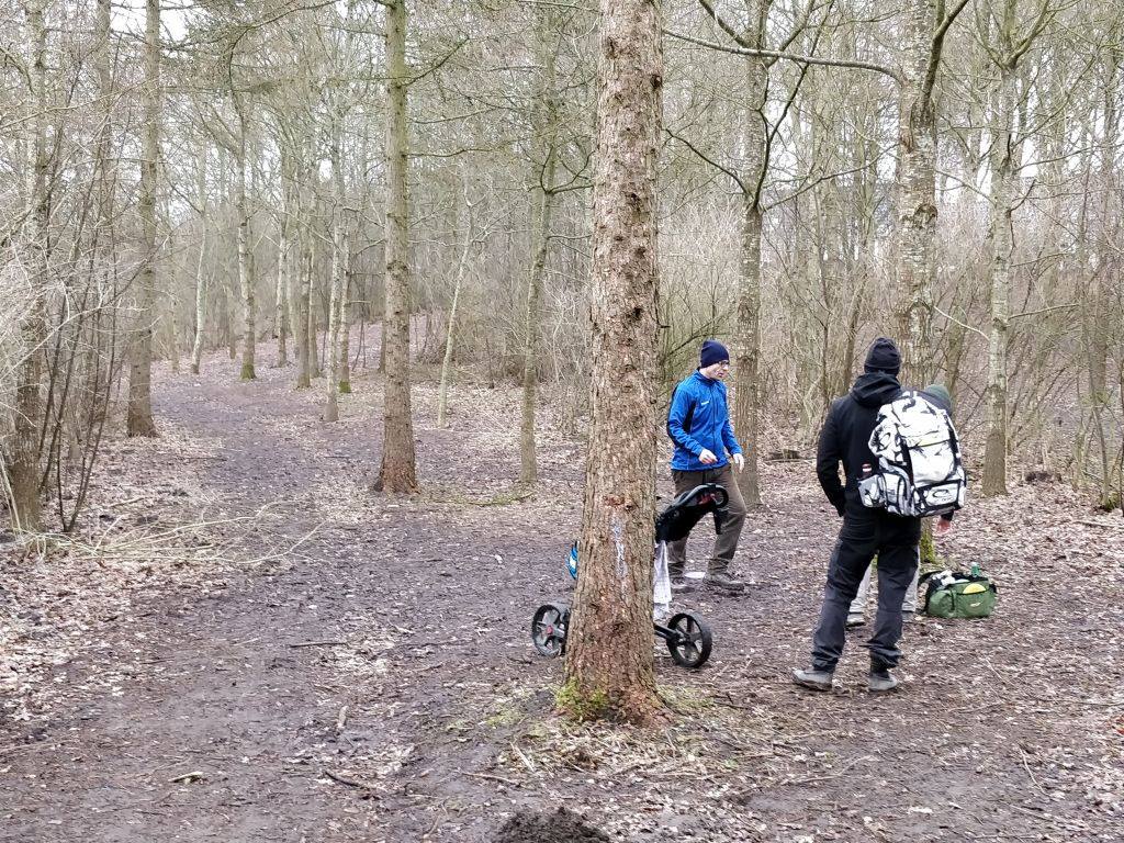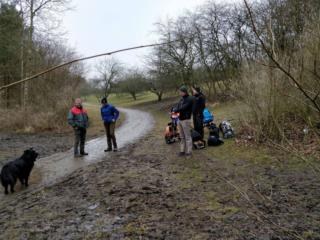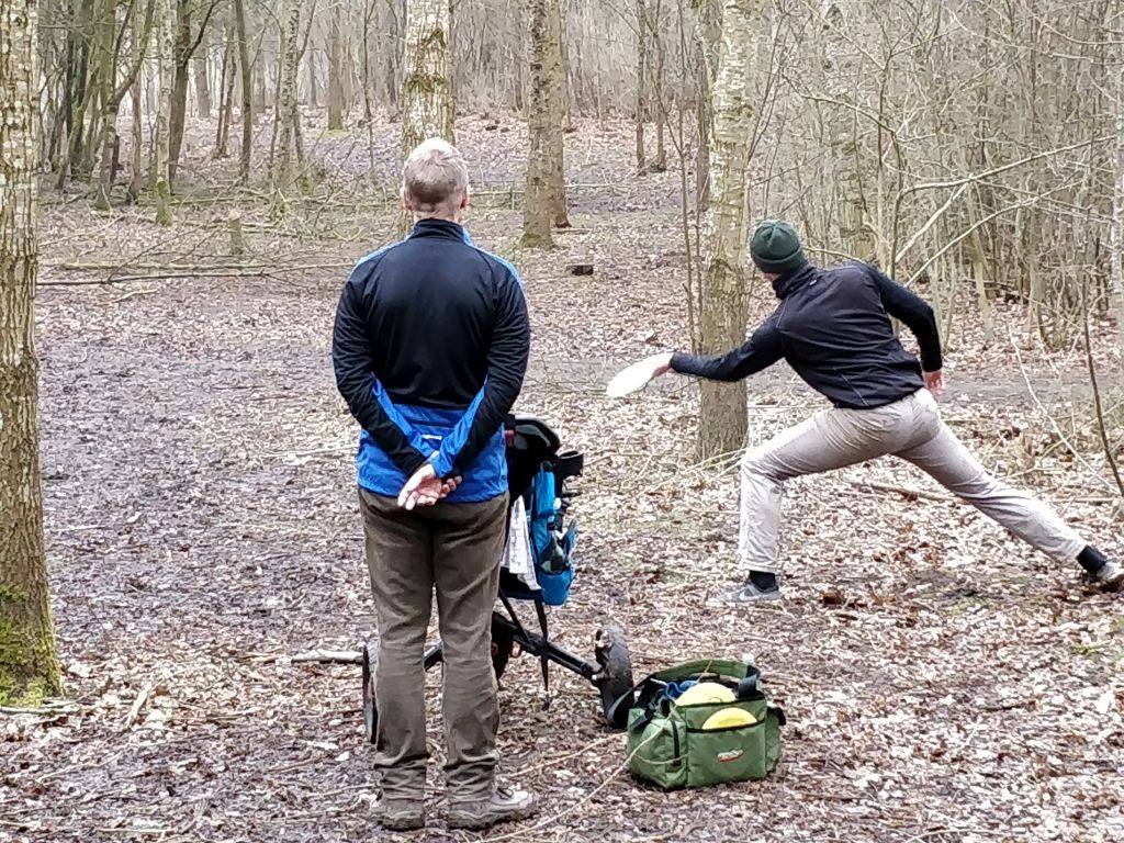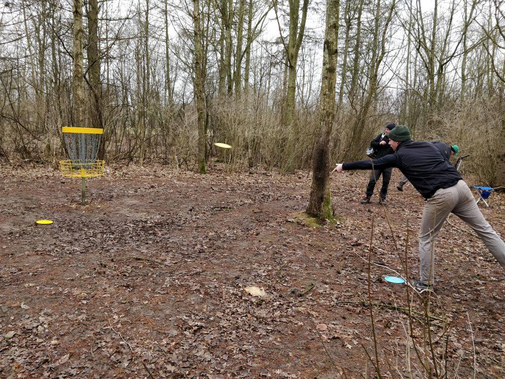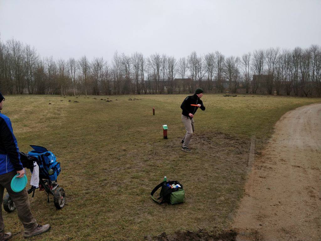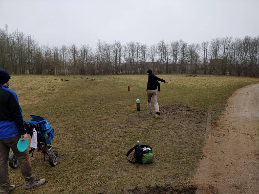 Als hätte man mich erwartet, erschienen noch fünf weitere Mitstreiter vom ortsansässigen Disc Golf Klubben Opdrift am Kurs, und nach einem mir noch nicht nachvollziehbaren Prozedere was wie Münzwerfen mit Puttern aussah wurde irgendwie bestimmt, dass ich die Ehre hatte, mit dem lokalen 938-rated "Big Arm" Kasper die 18 Bahnen anzugehen. Neben ihm spielte auch Jakob Burkard (Rating 944) vom weißen Tee, wir anderen durften vom gelben Tee ran. Es wurde nach dem "best-shot"-Modus gespielt, so dass mein nervöser erster Drive ins erste Hindernis keine großen Auswirkungen hatte. Dennoch spürten wir nach drei Bahnen mit zwei Wurf Rückstand den Druck, doch Kasper wusste zu beschwichtigen: "Bahn 17 ist noch nicht gespielt".