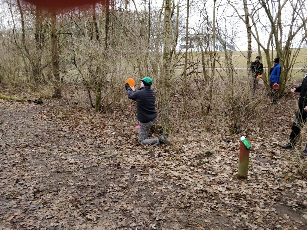 Das deutsch dänische Teambuildung nahm dann auch langsam Fahrt auf und - bis auf einen wirklich schwierigen 5m Putt mit freiem Sichtfeld im Straddle-Stand - hatte immer wenigstens einer einen mindestens brauchbaren Wurf parat und so zogen die drei Teams nahezu im Gleichschritt durch den Kurs - bis zur angekündigten Bahn 17: Par 5, ~200m, leicht bergab, das Fairway sowohl mittig als auch seitlich bestückt mit Bäumen. Vom weißen Tee muss der Anhyzer herhalten, vom gelben Tee reicht ein "einfacher" Hyzer mit der Midrange um sich den Sweetspot "center fairway" zu holen. Kasper und ich sind uns einig und landen nahazu gleich am rechten Rand mit der richtige Weite. Für die anderen beiden Teams beginnt die Reise durch die Bäume und sie verlieren jeweils zwei Wurf.