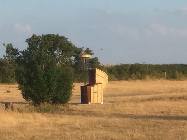 OB links und rechts, ein Baum steht 10m vor der Nase, also leichter Hyzer, das hat bisher immer gut funktioniert, aber dieses Mal landete das Ding im OB rechts. Egal. Weiter angreifen. Wurf 3 ca. 80 m bis zum Doppelmando kurz vor dem Korb. Vorlegen? Neee! Nicht heute in dieser Finalrunde. Ich warf also Vollgas Richtung Korb und was kommt? Die Scheibe skipt 10 m rechts vor dem Mando und ich hoffte auf einen Linksdrall. Aber sie sprang fast nur gerade, rechts am Mando vorbei, und lag dann 1 m neben den Korb! Na Prima!Dann der Dropzone-Wurf aus 10m durch das Doppelmando, Putt = 6 Wurf. Egal. Weiter auf Angriff an Final-Bahn 6, Par 4 (160m mit dem Strandkorb).