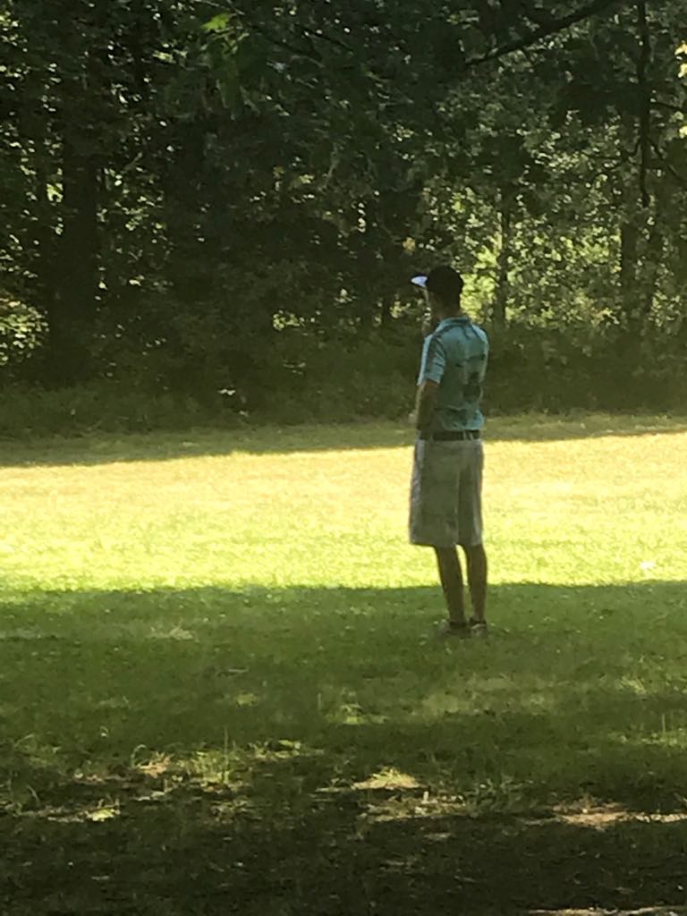 Sonntag dann Shotgunstart der 72, die den Cut geschafft haben beim Challenger, damit alle noch beim Leadingflight der Pros zuschauen können, super organisiert das Ganze! Stephan im Finale mit einer +3 und einem guten 22. Platz am Ende. Ich testete die beiden einzigen OB-Felder des Kurses an, die ich vorher noch gar nicht gefunden hatte. Es war eine Berg-und Talfahrt über 18 Bahnen. Zum Abschluss eine +5 und der 5. Platz am Ende enttäuschten ein wenig! Ich hatte jedoch großen Spaß mit meinem Pushie Andreas, der meinen Züca die ganze Zeit schob, anstatt ihn zu ziehen. Als wir dann noch Simon Lizotte bestaunen durften, wie er fast den Kursrekord von Eagle und Ricky auf +17 schraubte hat der Tag einen super Abschluss gefunden.